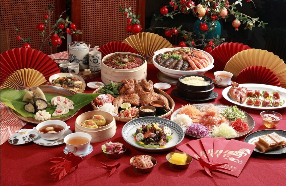 Bàn tiệc đầu xuân thêm phần trọn vẹn với Yu Sheng cá hồi, Poon Choi, Heo sữa quay, Há cảo bào ngư nhân thịt, mỗi món ăn là một lời cầu chúc cho tài lộc hanh thông, phúc khí viên mãn.