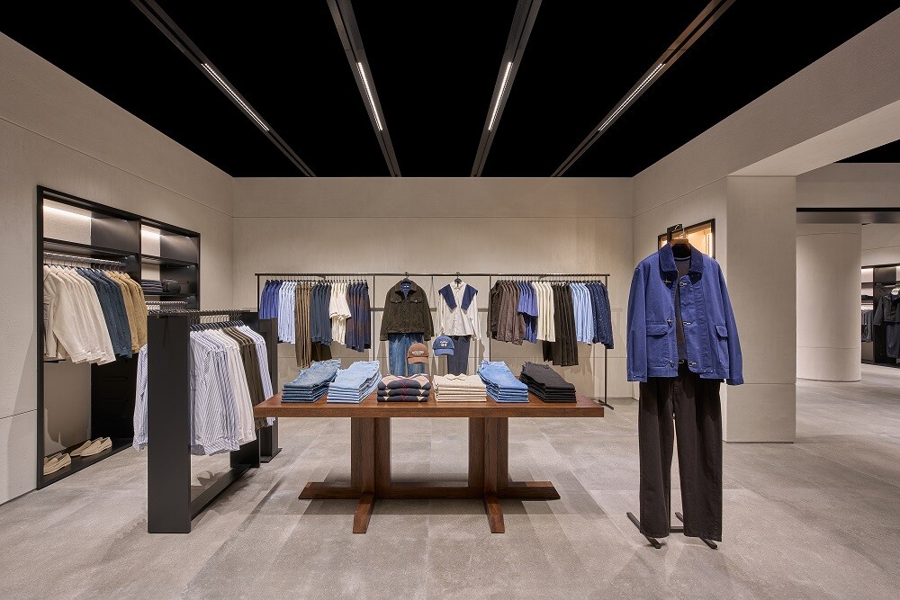 Khu vực thời trang nữ được bố trí tại tầng trệt với trần cao và vật liệu như gỗ sồi, bề mặt xử lý sẫm và kim loại sơn mài đen. Không gian tầng hầm dành cho dòng sản phẩm hướng đến nhóm khách hàng trẻ, sử dụng thép không gỉ, trần tối màu và kết cấu gợi nhắc ngôn ngữ công nghiệp để phân tách các khu trưng bày. Khu vực thời trang nam tiếp nối cùng nguyên lý kiến trúc, với bảng vật liệu xoay quanh các tông xám đậm và bề mặt đá cẩm thạch. Ở cả hai nơi, các khu vực bán hàng mở được đặt cạnh những phòng trưng bày, kết nối bằng hệ khung gỗ tối màu, đóng vai trò chuyển tiếp giữa các không gian.